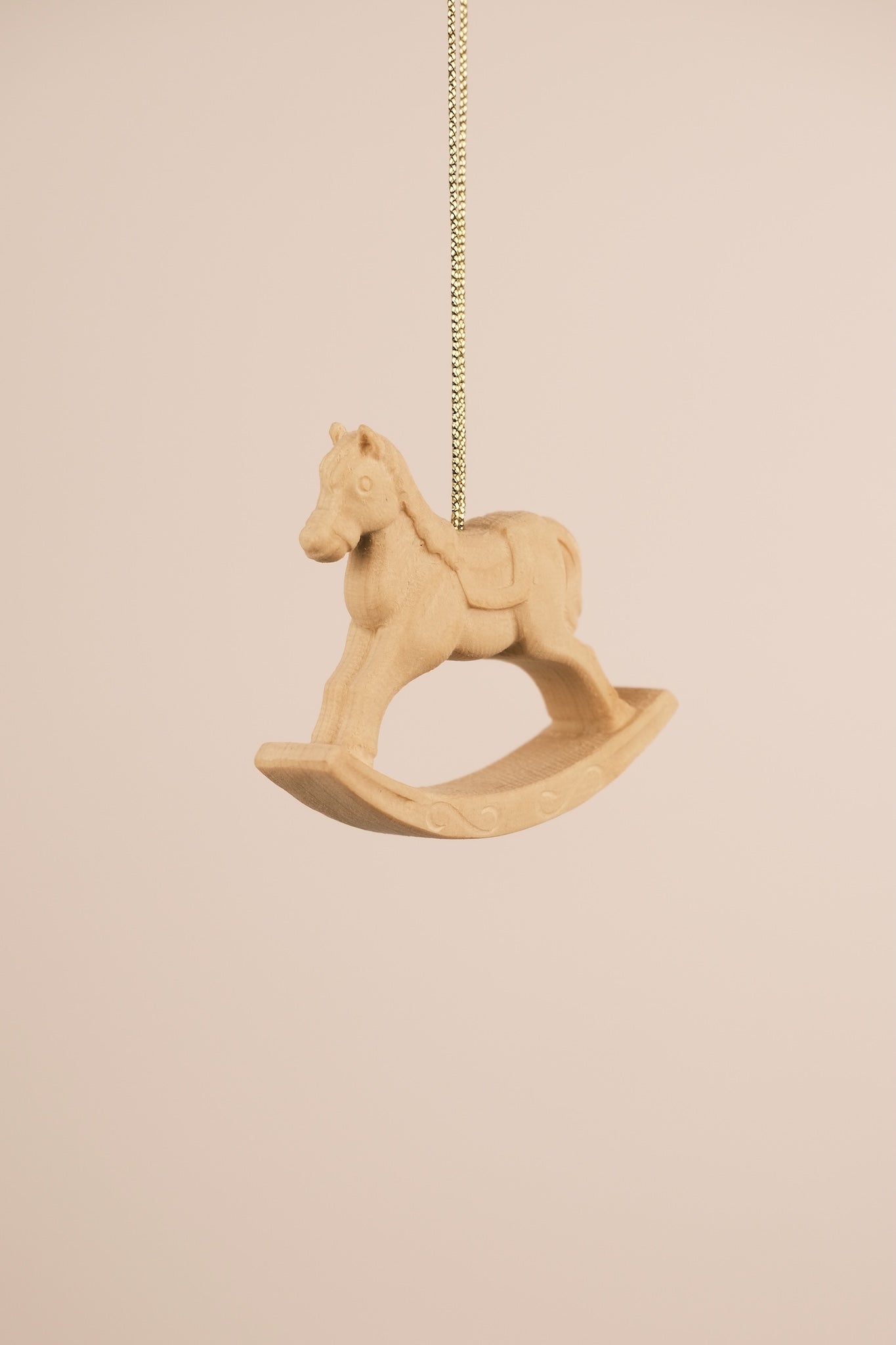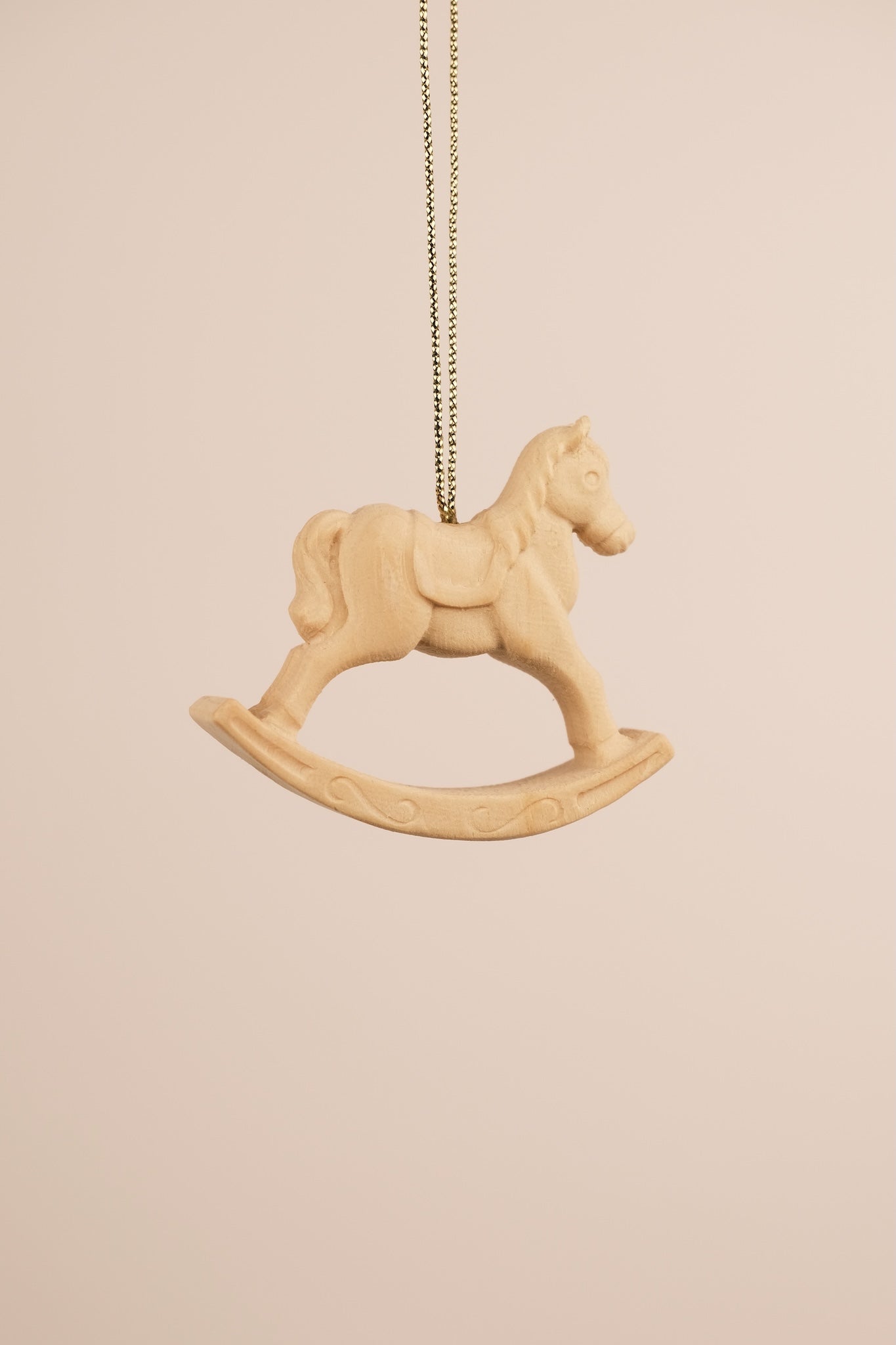 Cavallo a dondolo intagliato minuziosamente in legno di cirmolo dal profumo rilassante.