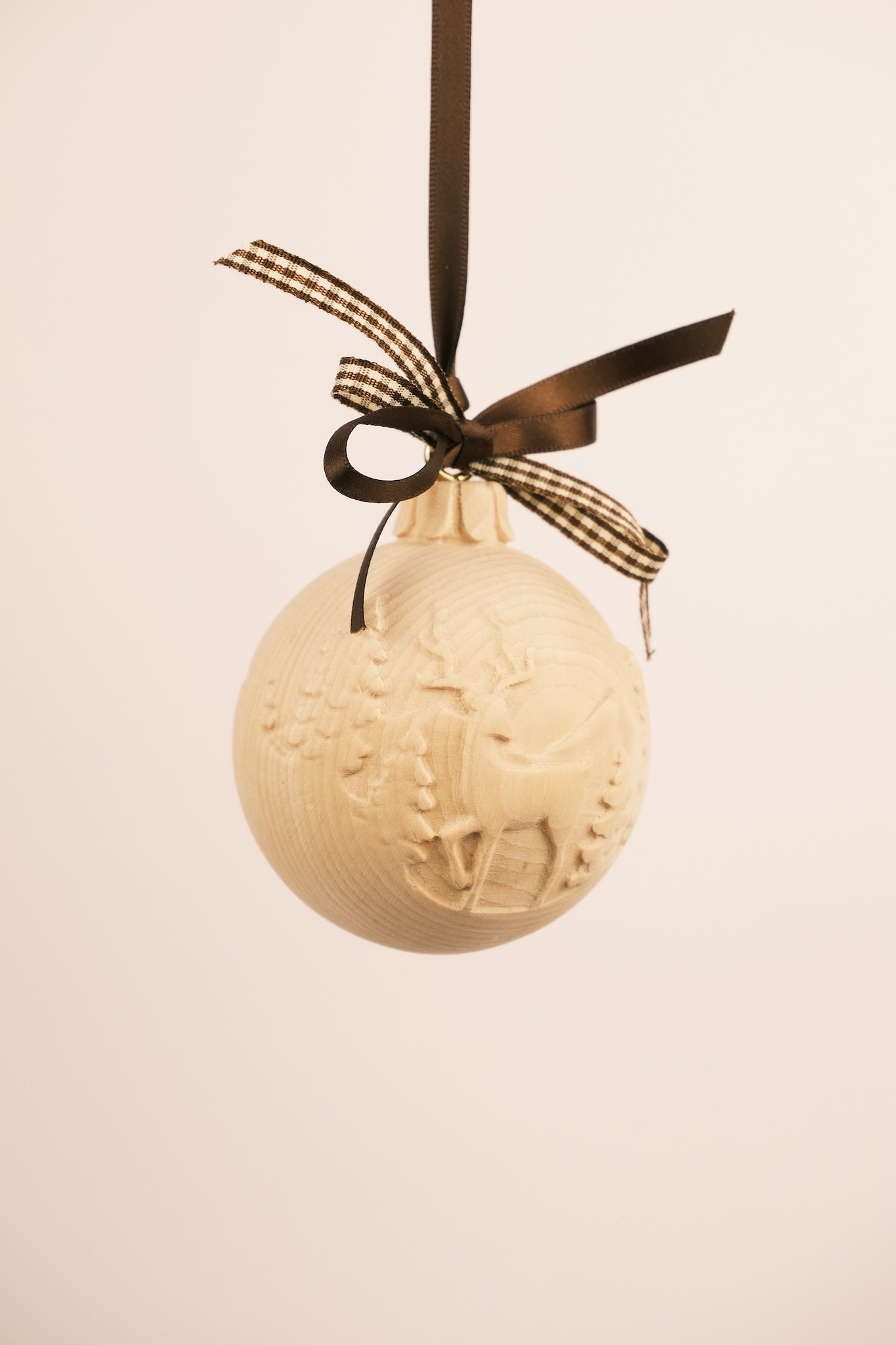 La sfera natalizia raffigurante un cervo nel bosco e stelline è finemente intagliata in legno naturale di cirmolo, noto per il suo profumo delicato che ricorda l’atmosfera di un bosco invernale.
