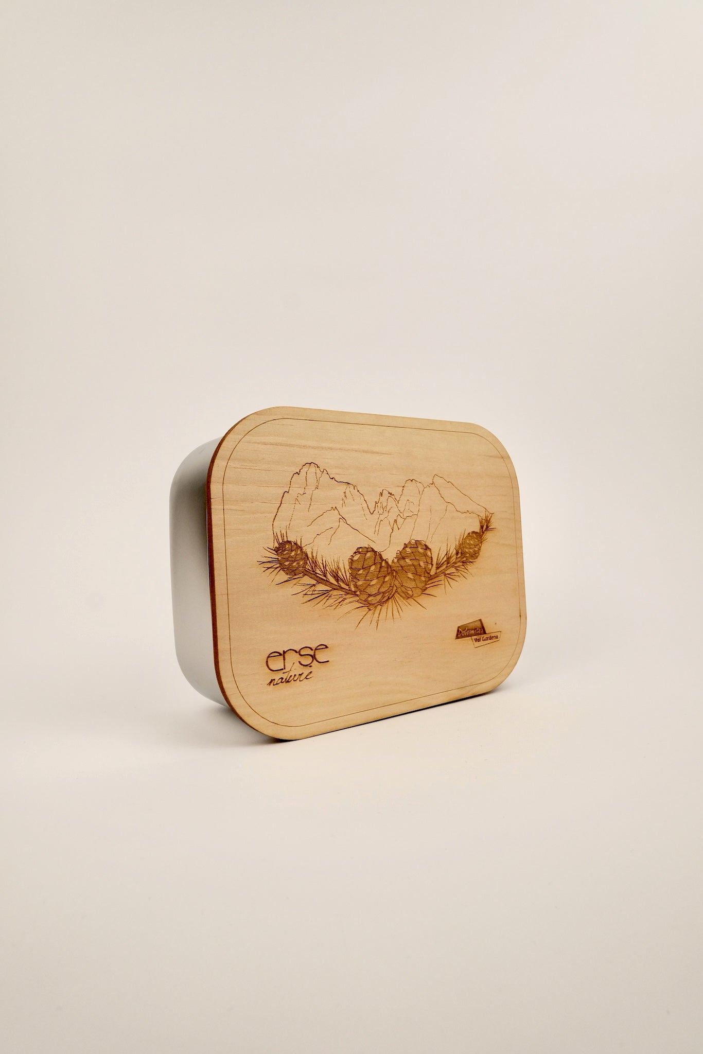 Questo lunchbox, decorato con l’immagine del Sassolungo e con motivi di pigne e aghi di cirmolo, combina funzionalità e connessione con la natura, ideale per portare con te l’aroma autentico del bosco durante le giornate in ufficio, a scuola o in escursione.