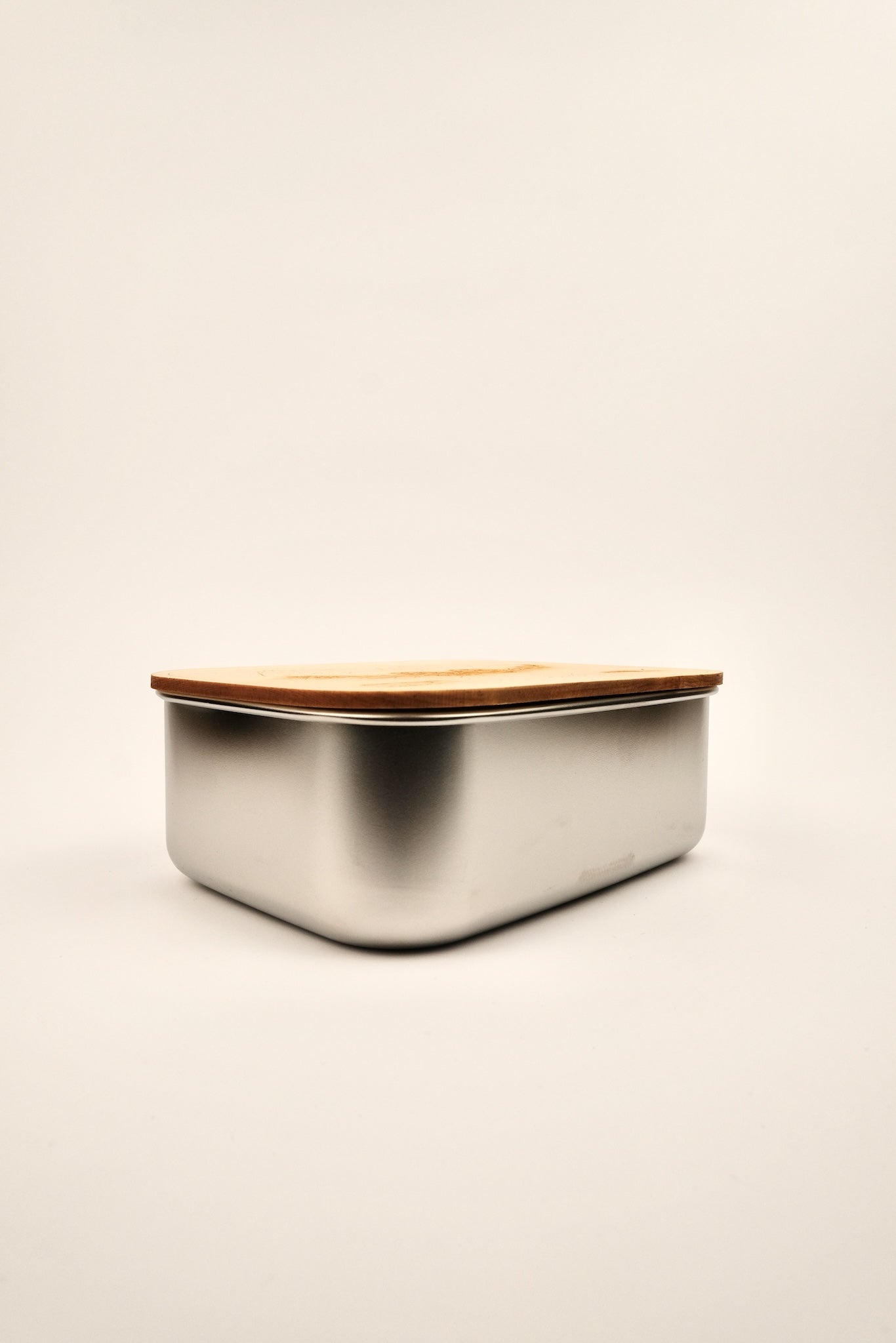 Contenitore in acciaio inox con coperchio in legno di cirmolo, riconosciuto per le sue proprietà antibatteriche che contribuiscono a mantenere il cibo fresco più a lungo.