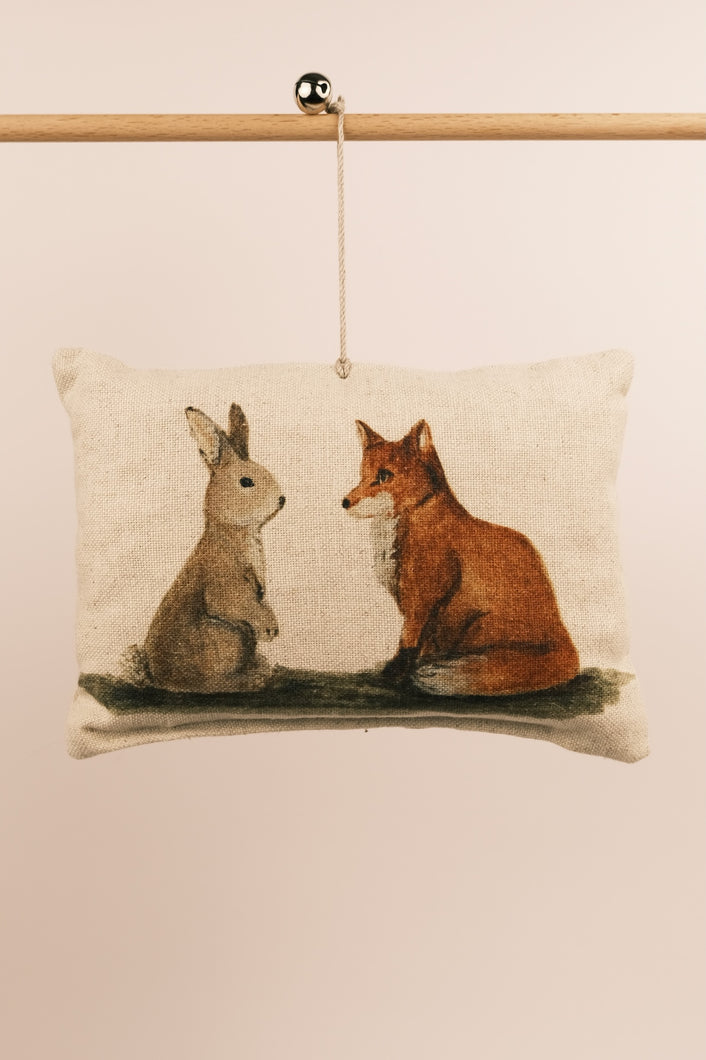 La lepre e la volpe - cuscinetto con fiocchi di legno di cirmolo