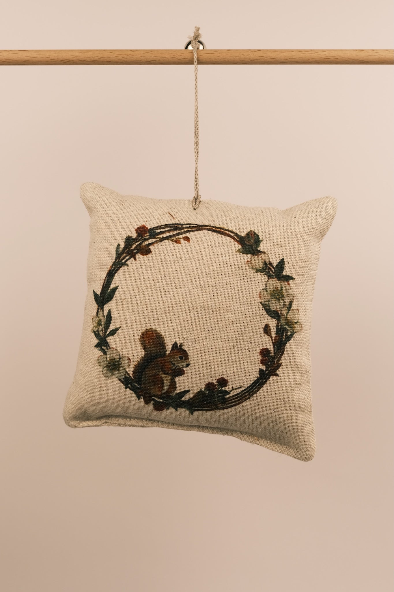 Cuscinetto quadrato da appendere con stampa artigianale di uno scoiattolo sul tessuto. Presenta un piccolo campanellino fissato al cordino.