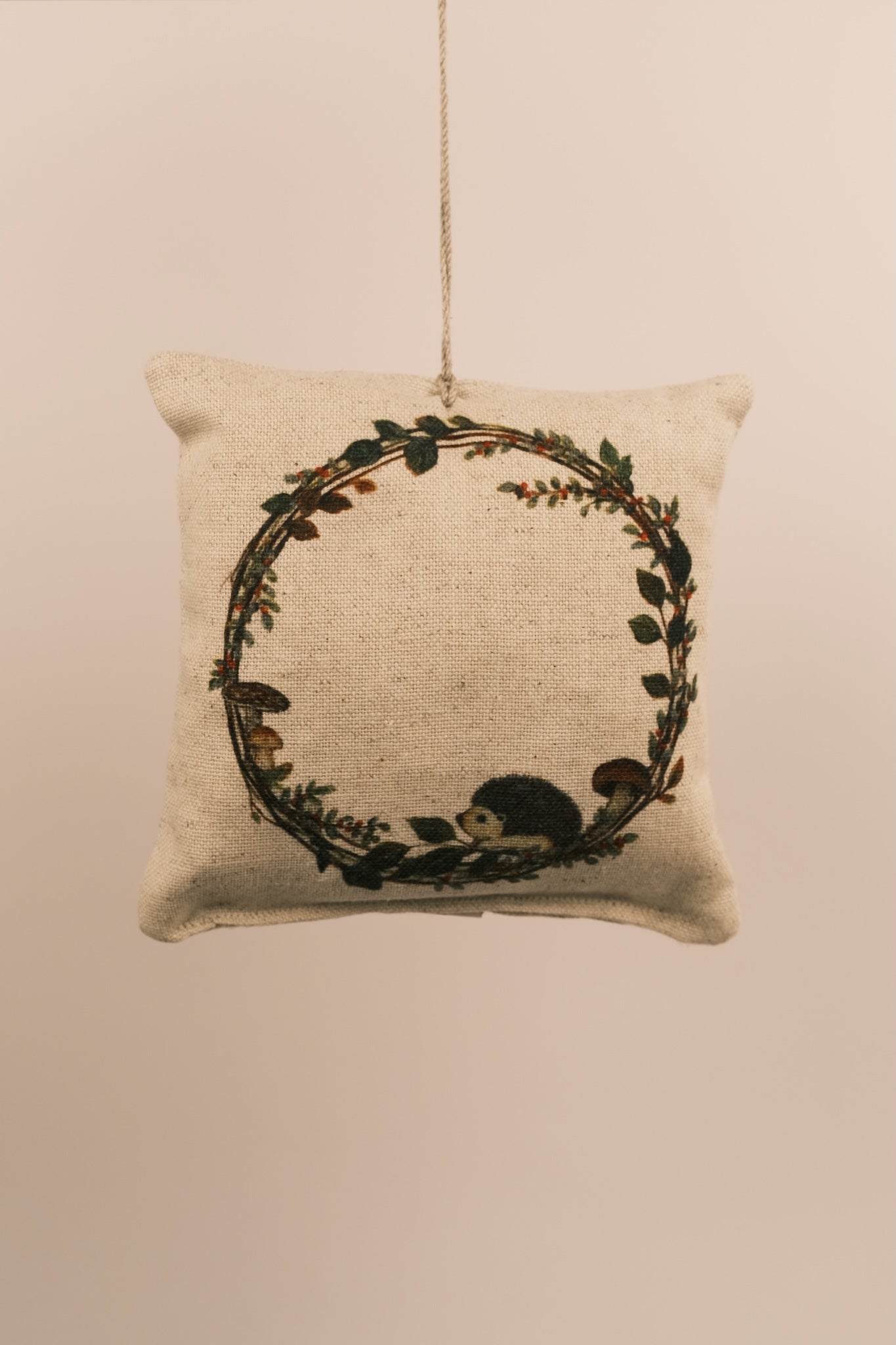 Cuscinetto quadrato da appendere con stampa artigianale di un riccio sul tessuto. Presenta un piccolo campanellino fissato al cordino.